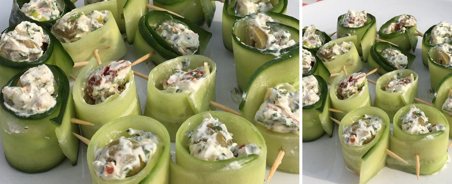Nehmen Sie die Gurkenstreifen einzeln und geben Sie einen gehäuften Teelöffel der Füllung auf den unteren Teil des Streifens. Rollen Sie den Streifen so eng wie möglich zusammen und stechen Sie ihn mit einem Cocktailstäbchen durch, um ihn zusammenzuhalten.