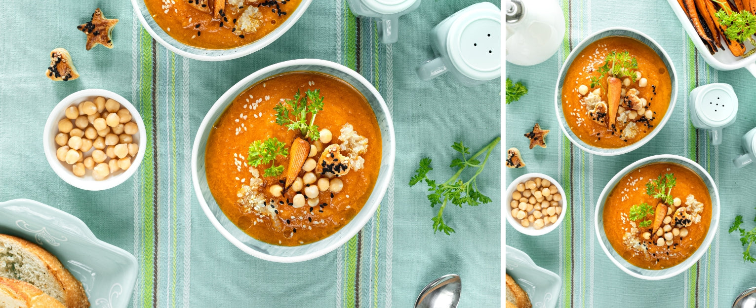 Genieße deine leckere Kürbis-Karotten-Suppe mit Kichererbsen!