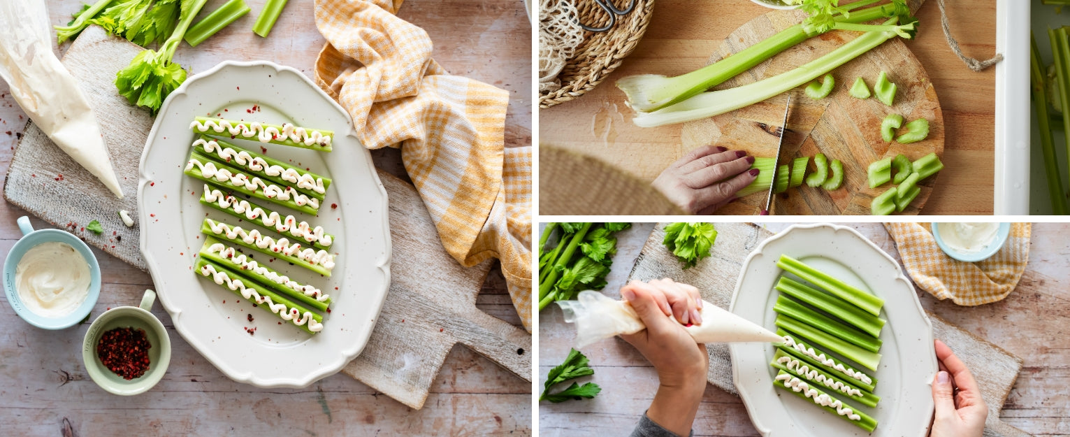3. Fülle die Selleriesnacks mit Joghurt-Dip: